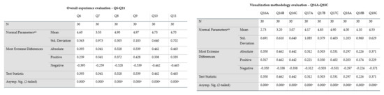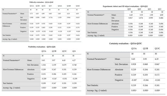 Results from normalization analysis for each question category in the survey based on the Kolmogorov–Smirnov one-sample test. The superscript “a” signifies that the analysis was made with the assumption that the test distribution is normal, while superscript “b” shows that the values were computed directly from the experiment dataset.