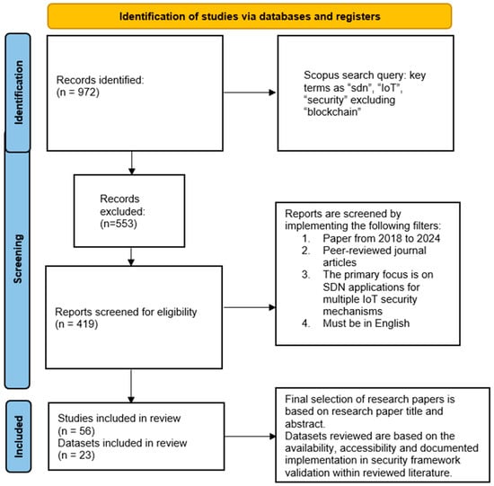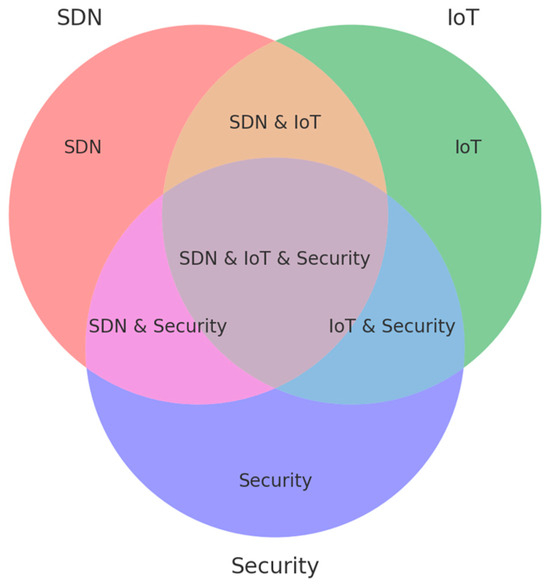 The literature search employed the Scopus database for its comprehensive academic coverage. A Boolean query (“SDN” AND “IoT” AND “security” NOT “Blockchain”) was strategically constructed to identify articles examining the intersection of software-defined networking and IoT security frameworks while excluding blockchain-focused research, which yields 972 papers for review. This approach ensured targeted retrieval of publications addressing the core research questions raised in research objectives 1 and 2 while maintaining domain specificity, as visually represented in Figure 1, where the central area in the Venn diagram in Figure 2 represents the precise scope of investigation.