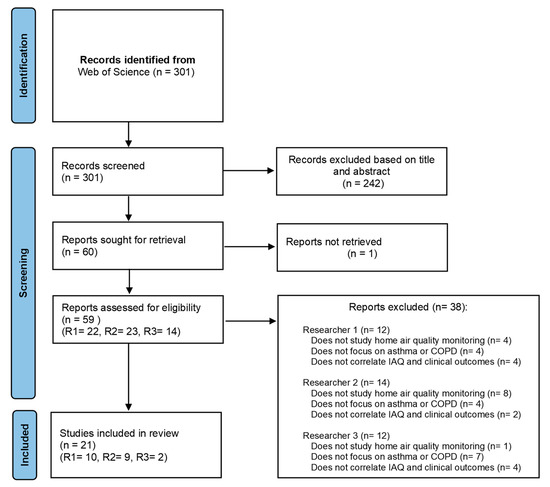 The database search revealed 301 records. The title, abstract, and keywords were reviewed and 242 articles that did not meet inclusion criteria were excluded. One article could not be retrieved, and the full text of the remaining 59 potentially relevant articles was assessed. Thirty-seven articles were excluded. Reasons for exclusion included the following: not involving a study on home air quality monitoring (N = 13); not focusing on asthma or COPD (N = 15); and not correlating IAQ and clinical outcomes (N = 10). Finally, 21 articles were included, all published in English. The PRISMA flow diagram illustrated in Figure 1 describes the process followed in this review.
