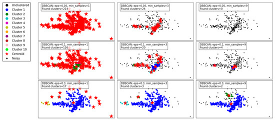 One of DBSCAN’s key strengths is its robustness to outliers. Since noise points are explicitly marked and excluded from clusters, the presence of outliers does not significantly affect the clustering results [40]. However, the algorithm’s performance is sensitive to the choice of and , which require careful tuning to achieve optimal clustering.