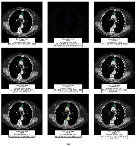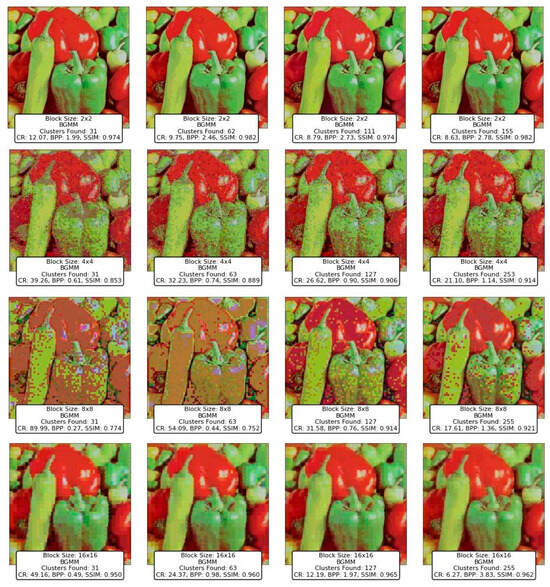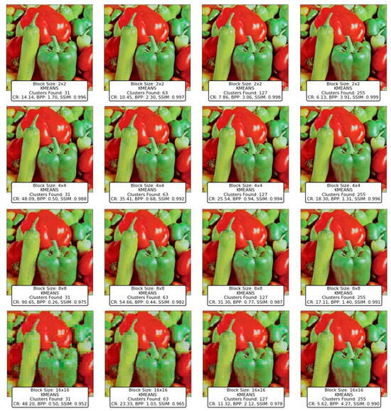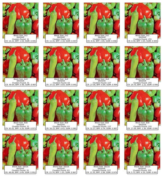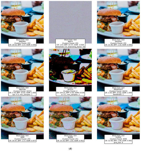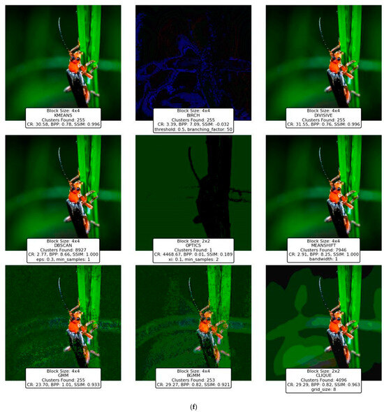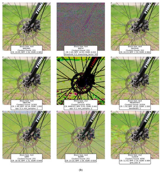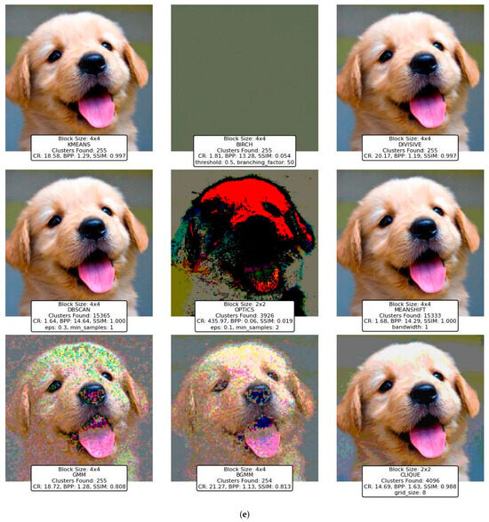The findings highlight the versatility and efficacy of clustering-based approaches, with K-Means, Divisive Clustering, and CLIQUE emerging as the most reliable methods. K-Means demonstrated exceptional adaptability, balancing compression efficiency and image quality, making it a go-to technique for various image types and complexities. Divisive Clustering, with its hierarchical methodology, proved adept at preserving structural integrity while achieving substantial compression, particularly for larger block sizes. CLIQUE, leveraging its grid-based strategy, offered a unique combination of high CR and SSIM values, placing it as a strong contender alongside K-Means and Divisive Clustering. While the GMM and BGMM were effective in retaining structural details, their compression efficiency was slightly lower than the top-performing techniques. Mean Shift preserved image quality but suffered from low CR, limiting its practicality. Techniques like BIRCH, DBSCAN, and OPTICS struggled to balance compression and quality, often yielding distorted images or suboptimal CR values.