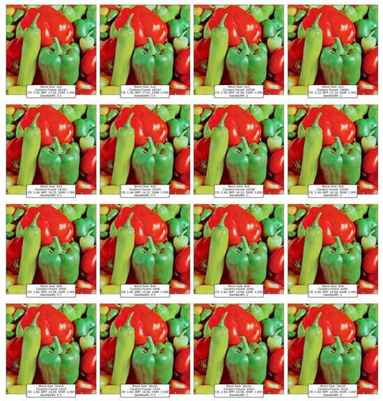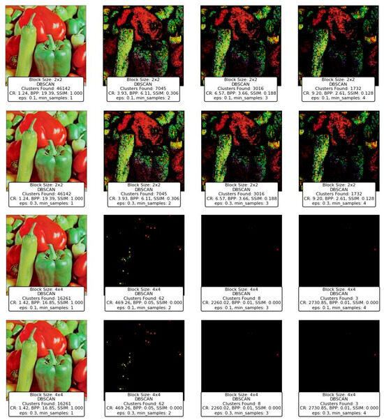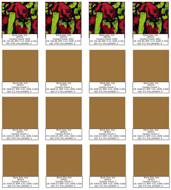 This paper explores the application of nine clustering techniques to image compression: K-Means, Balanced Iterative Reducing and Clustering using Hierarchies (BIRCH), Divisive Clustering, Density-Based Spatial Clustering of Applications with Noise (DBSCAN), Ordering Points to Identify the Clustering Structure (OPTICS), Mean Shift, Gaussian Mixture Model (GMM), Bayesian Gaussian Mixture Model (BGMM), and Clustering In Quest (CLIQUE). Each method offers unique advantages and challenges, depending on the characteristics of the image and the specific parameters used. One of the critical research questions is the importance of parameter tuning in achieving optimal results. For example, the choice of block size significantly impacts the performance of each technique [9]. Smaller block sizes often yield higher SSIM values (structural similarity index), preserving fine details in the image, but they also result in lower compression ratios due to the increased granularity [10]. Conversely, larger block sizes improve compression efficiency at the expense of detail retention, leading to pixelation and reduced visual fidelity. Similarly, clustering-specific parameters, such as the grid size in CLIQUE or the epsilon value in DBSCAN, play a pivotal role in determining the quality and efficiency of compression [11]. This underscores the need for a tailored approach when applying clustering techniques to image compression, taking into account the specific requirements of the application [12].