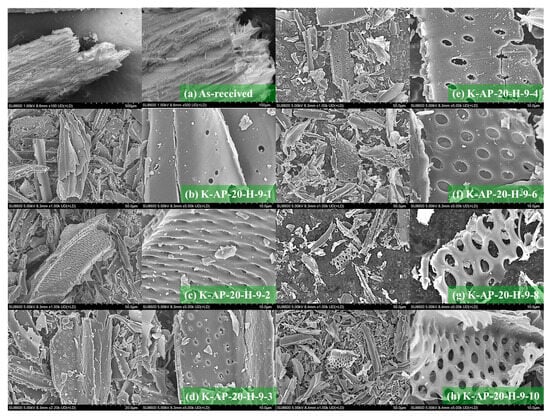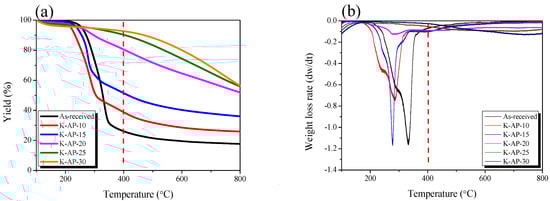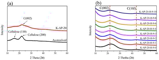 Figure 3a, the XRD pattern of the as-received specimen exhibits typical cellulose XRD pattern features (cellulose (110) and (200) peaks). In contrast, the K-AP-20 displays a distinctly broad C(002) peak at a diffraction angle of approximately 23°, deviating from the biomass XRD patterns. In