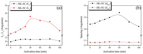 Figure 4a reveals that during the first 60 min, the AK-AC exhibited increases in the Lc and La of 9.87–11.33 and 31.90–43.02 Å, respectively. However, beyond 60 min, these values decreased to 10.28 and 33.80 Å, respectively. An XRD analysis provides statistical data for the crystallite structure changes in porous carbon materials. As previously noted, physical activation induces oxidation reactions in the amorphous regions and crystallite edges [