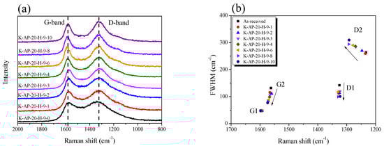 Together with XRD, Raman spectroscopy serves as a valuable analytical method for examining crystallite changes in porous carbon materials. As opposed to an XRD analysis, Raman spectroscopy is a useful method for analyzing the crystallite changes in carbon materials by providing information regarding the atomic bonding of different aspects of the microstructures of carbon materials. This study employed Raman spectroscopy to conduct a detailed analysis of the AK-AC evolution in terms of its carbon atomic bonding, structural defects, and crystallite changes throughout the activation period.