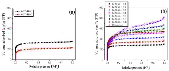 3/g, respectively. Note that the pore characteristics of K-C-H-9-3 could not be analyzed due to the complete oxidation of the carbon crystallite that left only ash residue. Conversely, compared to the CK-AC, the AK-AC demonstrated superior pore characteristics, achieving specific surface area and mesopore volume increases, from 1080 to 1940 m