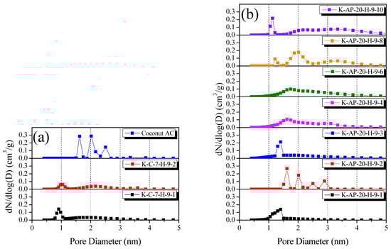 Figure 8 shows that as the activation time increases, the PSD curves of the AK-AC show the progressive development of both the micropores and mesopores. Notably, after 40 min, the AK-AC exhibits a significant development of mesopores, with diameters ranging from 2 to 4 nm. In contrast, the Coconut AC only shows the development of micropores and mesopores with diameters less than 3 nm. As a result, despite having a similar specific surface area to that of K-AP-20-H-9-6, the Coconut AC exhibits a lower breakthrough point and capacitance values, which can be attributed to its underdeveloped PSD in the 2.8–3.8 nm diameter pore range.