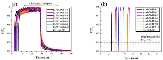 The breakthrough curve technique is commonly utilized to evaluate the harmful gas adsorption characteristics of porous carbon. In this study, breakthrough curves were employed to evaluate the butane adsorption characteristics of the AC. The breakthrough point of the breakthrough curve was set at C/C0 = 0.1.