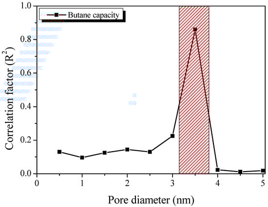 Figure 8, the PSD curves of each activated carbon were divided into 0.5 nm increments over a pore diameter range of 0.0–5.0 nm. The sum of the pore volumes of each activated carbon over the range of pore diameters was then calculated and plotted with the butane adsorption capacity of each activated carbon (X-axis: pore volume according to pore diameter, Y-axis: butane adsorption capacity). Finally, the correlation between the pore volume and butane adsorption capacity as a function of the pore diameter for each calculated activated carbon is shown in