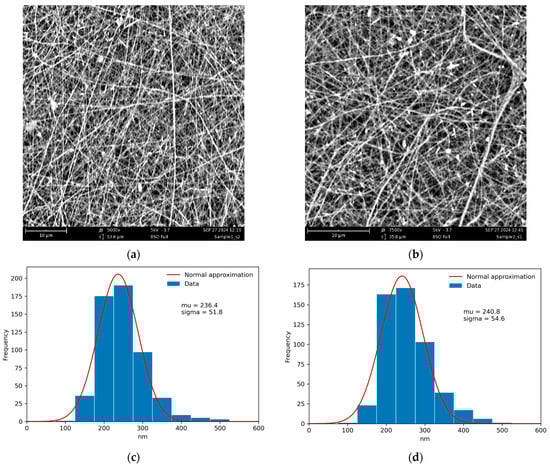 SEM images of the CS-HNT (a), CS-HNT-CP (b) nanofibers, and corresponding fiber diameter distributions (c,d). The distributions were obtained using ImageJ software (Version 1.54 K).
