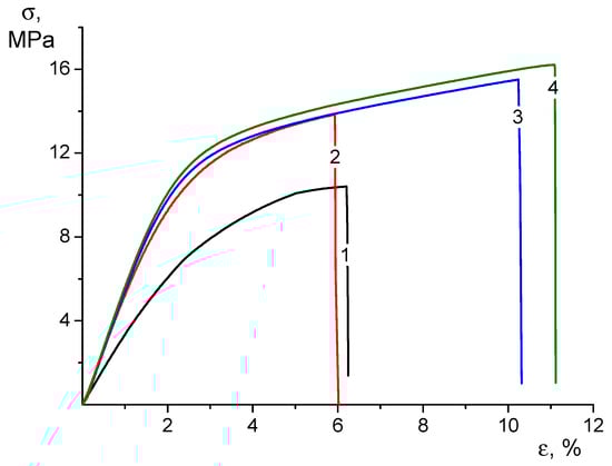 Stress–strain curves of CS-0 (1), CS-HNT (2), CS-CP (3), and CS-HNT-CP (4) electrospun mats.