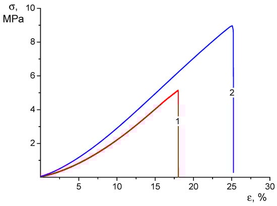 When analyzing these results, it should first be noted that swelling caused a profound change in the qualitative appearance of the stress–strain curves of the tested materials (compare Figure 3 and Figure 4). In the process of tensile stretching of swollen nonwoven materials, the stress grows monotonically as the strain increases with a successive increase in the value of dσ/dε. Therefore, it is not possible to determine the yield strength from the strain curve.