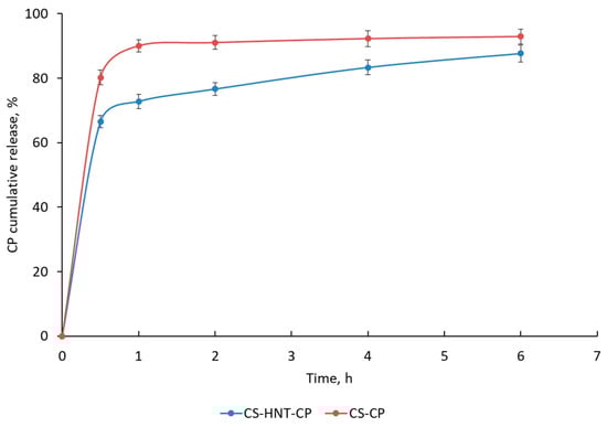 In vitro studies have shown that the CS-based nonwoven doped with HNTs (CS-HNT-CP) provides a modified drug release profile compared to the HNT-free mat (Figure 5). The HNT-free mat (CS-CP) was characterized by rapid CP release (about 80–90% of the drug was released within 0.5–1 h). In the case of the HNT-containing mat (CS-HNT-CP), two phases are observed on the kinetic curve: (1) an initial burst release of CP (66% of CP is released within 0.5 h) and (2) a subsequent sustained release of CP (88% of CP is released within 6 h) (Figure 5). This two-phase drug release profile is explained by the high initial release of CP located on the surface of the highly porous nanofibrous material. The delayed release of CP is apparently ensured both by the effects of the interaction of the HNT network with the protonated amino groups of CS and by hydrogen bonds between CS and PEO, which are described for CS/PEO blends in a ratio of about 4:1 []. In addition, CP can be incorporated into the nanofiber during its formation by electrospinning.