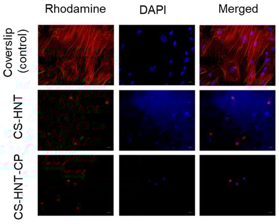 It was found that both the investigated electrospun mats and coverslip (control) contained adherent cells with typical morphology. The MSCs on the coverslips represented a confluent/sub-confluent monolayer of evenly distributed, elongated cells with multiple syncytium-like structures; cells in the process of mitosis were also observed. Microfilaments of cell actin were clearly visible as longitudinal structures stained in red. However, in the experimental samples (CS-HNT and CS-HNT-CP), rounded cells with few outgrowths and with diffuse cytoplasmic staining were observed. It can be concluded that such cells were in a state of apoptosis (Figure 6).