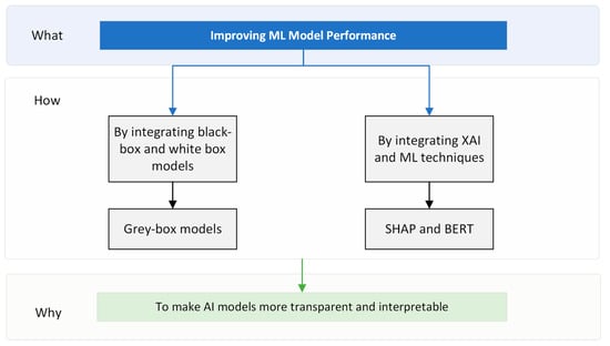 | Improving ML Model Performance | Integrating XAI and ML techniques. They utilised SHAP with BERT, which allowed for a more precise understanding of the model’s decisions and contributed to the refinement and accuracy of the classification process. | [39] |
