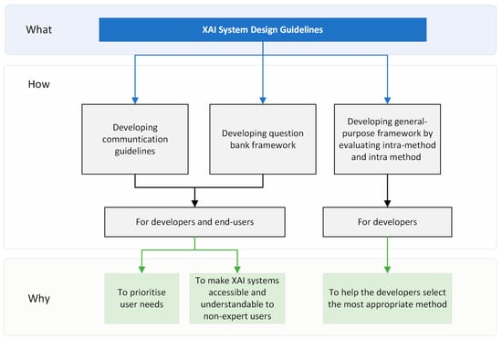 | XAI System Design Guidelines | Developing question bank framework for developers and end-users who ask about an AI system, facilitated by an informed algorithm. | [54] |