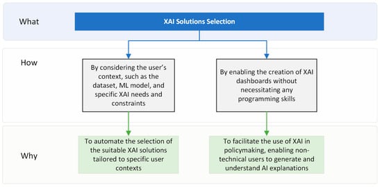 | XAI4PublicPolicy framework | A no-code solution for XAI to facilitate the use of XAI in policymaking, enabling non-technical users to generate and understand AI explanations and enabling the creation of XAI dashboards without necessitating any programming skills. | The framework automates the creation of XAI dashboards through a model executor, which manages the selection of models, datasets, and charts, generating explanations. It also improves the functionality and performance of the XAI system. | [52] |