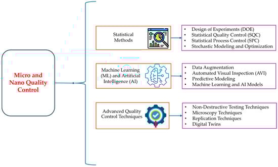 QC in micro–nano technology is critical to ensuring the reliability and performance of devices and materials at the microscopic scale. As nanotechnology continues to advance, researchers and manufacturers have developed sophisticated methods to maintain high standards in production and characterization. In the following section, we discuss the current techniques used for quality control in micro–nano technology, the challenges faced in this area, and the application of micro–nano technology in quality control in various fields. A brief quality control process diagram is shown in Figure 1, and various micro and nano quality control techniques are shown in Figure 2.