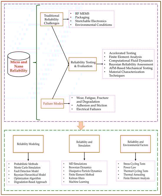 In contrast, nano-reliability pertains to the dependability of nanoscale systems and devices, typically involving components that range from a few nanometers to a hundred nanometers. At the nano-level, materials exhibit unique physical, chemical, and mechanical properties due to quantum effects, surface interactions, and atomic-scale behaviors. As a result, traditional reliability theories often need significant adaptation or replacement to address these differences. Recent research by Kapoor et al. [167] demonstrates significant advancements in drug delivery systems through the use of cyclodextrin-based nanosponges (CDX-NSP). This study highlights how CDX-NSP improves the solubility, stability, and bioavailability of anticancer drugs, exemplifying the impact of nanotechnology on enhancing the effectiveness of pharmaceutical compounds. Gradient elasticity theory has been proposed as an extension of classical continuum mechanics to address size-dependent behaviors in micro- and nanoscale systems. This theory integrates higher-order stress and strain gradients, addressing the limitations of traditional approaches that do not consider material length scales. By incorporating these gradients, the theory provides a more accurate representation of stress distribution, especially in regions near crack tips and interfaces, where standard mechanics predict singularities. This refined approach has proven particularly useful for modeling the mechanical behavior and reliability of micro- and nanoscale devices, such as MEMS and NEMS, which often feature geometric singularities and exhibit size effects that influence their operational stability and failure mechanisms [168]. Figure 7 illustrates the micro- and nano-reliability framework, serving as a visual summary of the discussed concepts and their practical applications in enhancing device reliability.