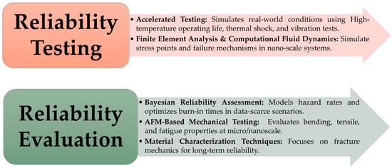 Reliability Evaluation: Reliability assessment is crucial for the advancement of micro- and nanotechnologies, which significantly contribute to the cost of multi-scale systems. The use of Bayesian methods in reliability assessments is increasing due to data scarcity, supporting the analysis of nanoscale components [210,270]. This approach helps in modeling hazard rates and optimizing burn-in times effectively. In addition, experimental studies on the mechanical reliability of devices, such as Kim et al.’s [271] study on micromirrors, show how alternative designs can significantly reduce stress and enhance device reliability. Isono [272] discussed various testing methodologies critical for evaluating the reliability of materials used in MEMS and NEMS devices. These include AFM-based bending and tensile tests for assessing mechanical properties at the micro- and nanoscales. Additionally, the paper explores cyclic fatigue testing and electrostatically actuated nano-tensile testing, which provide insights into the endurance and mechanical behaviors of materials under operational conditions.