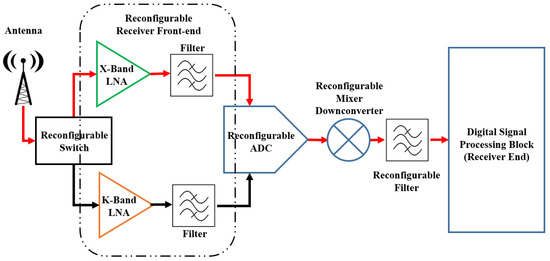 The deployment of fifth-generation (5G) and beyond-5G wireless communication systems necessitates advanced transceiver architectures to support high data rates, spectrum efficiency, and energy-efficient designs. This paper presents a highly adaptive reconfigurable receiver front-end (HARRF) designed for 5G and satellite applications, integrating a switchable low noise amplifier (LNA) and a single pole double throw (SPDT) switch. The HARRF architecture supports both X-band (8–12 GHz) and K/Ka-band (23–28 GHz) operations, enabling seamless adaptation between radar, satellite communication, and millimeter-wave (mmWave) 5G applications. The proposed receiver front-end employs a 0.15 μ pseudomorphic high electron mobility transistor (pHEMT) process, optimised through a three-stage cascaded LNA topology. A switched-tuned matching network is utilised to achieve reconfigurability between X-band and K/Ka-band. Performance evaluations indicate that the X-band LNA achieves a gain of 23–27 dB with a noise figure below 7 dB, whereas the K/Ka-band LNA provides 23–27 dB gain with a noise figure ranging from 2.3–2.6 dB. The SPDT switch exhibits low insertion loss and high isolation, ensuring minimal signal degradation across operational bands. Network analysis and scattering parameter extractions were conducted using advanced design system (ADS) simulations, demonstrating superior return loss, power efficiency, and impedance matching. Comparative analysis with state-of-the-art designs shows that the proposed HARRF outperforms existing solutions in terms of reconfigurability, stability, and wideband operation. The results validate the feasibility of the proposed reconfigurable RF front-end in enabling efficient spectrum utilisation and energy-efficient transceiver systems for next-generation communication networks.