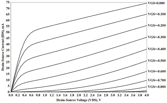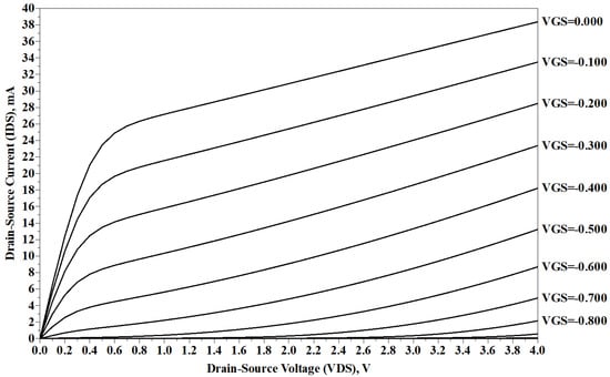 The drain current () is plotted versus the drain-source voltage (), where the operating point is chosen at , , and . The power dissipation for a three-stage low-noise amplifier (LNA) design is determined by: