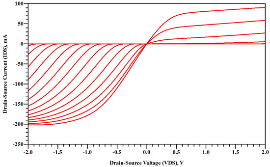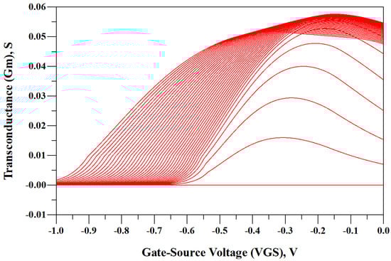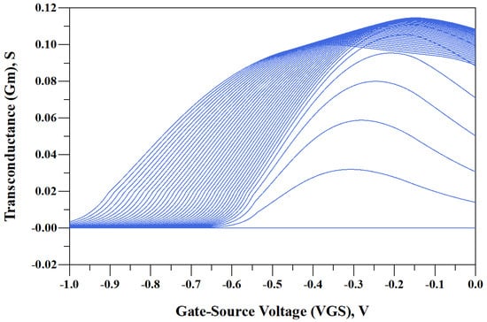 Figure 5 and Figure 6 display the transconductance characteristics of two different sizes of InGaAs pHEMTs, 2 × 50 and 4 × 50 , respectively. The transconductance is defined as: