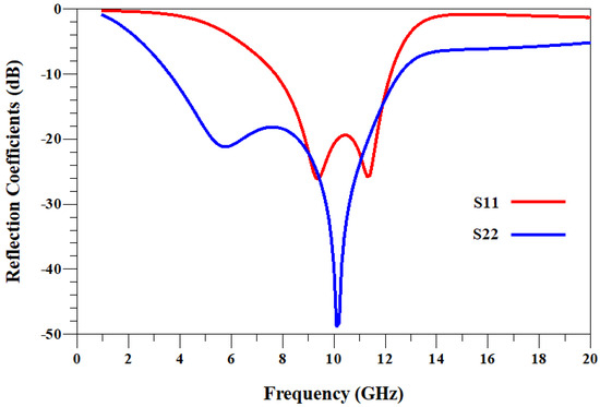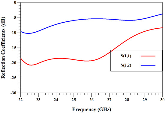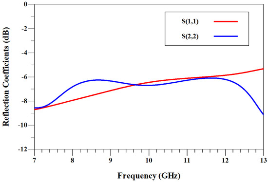 Figure 23 shows the input and output reflection coefficients for the active X-band arm. Both reflection coefficients are better than dB across 8–12 GHz, which is acceptable for many practical applications.
