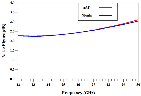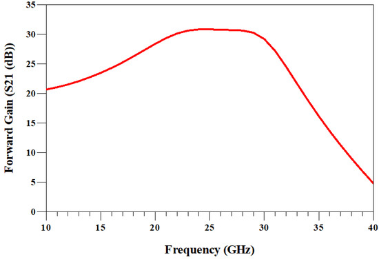 In Figure 27, the input and output reflection coefficients remain better than dB throughout 23–28 GHz. This indicates a suitably matched design for the K/Ka-band.