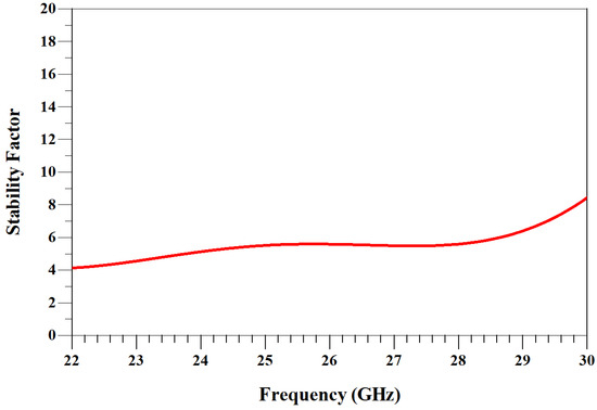 The stability factor (based on Rollet’s criterion) is shown in Figure 24, where the design remains unconditionally stable across all frequencies of interest. This indicates that no risk of oscillation arises under typical source and load impedances.