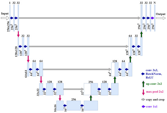 U-Net is widely regarded as a standard convolutional neural network architecture for biomedical image segmentation tasks. The architecture comprises two main components: a contracting path, which captures global context and feature hierarchies, and a symmetric expanding path, which enables precise localization of structures. The basis of the network of our study is the U-Net project (https://github.com/zhixuhao/unet, accessed on 2 December 2024). In the original project, U-Net was used for the binary classification of membranes.