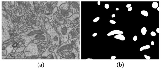The electron microscopy 1024 × 768 image from the EPFL dataset of a mouse brain and mitochondrial annotation: (a) EPFL layer; (b) annotation mask.