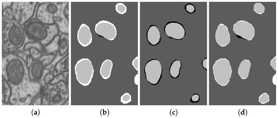 Markup differences (background—dark gray, intersection areas—light gray): (a) original EPFL EM fragment; (b) EPFL (black)/our (white) markup; (c) Lucchi++ (black)/EPFL (white) markup; (d) Lucchi++ (black)/our (white) markup.