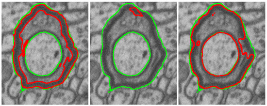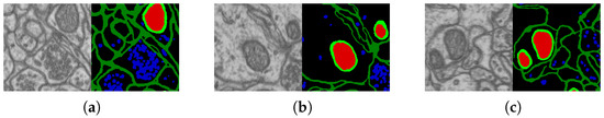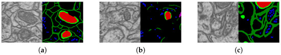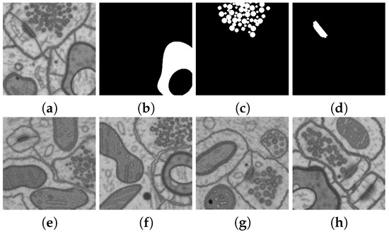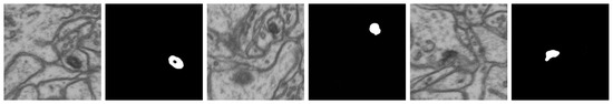 The research presented in this section is a development of our work [34,35]. We present new samples of synthetic images generation as the main method of augmentation for classes that are underrepresented in the dataset. In the EPFL dataset, this is an axon class (see Figure 3).