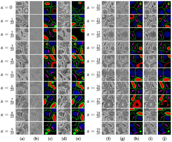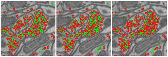 Figure 5 shows examples of good generation using the diffusion model. Layers of masks are translated into one image, where different classes are marked with different colors: red—the inside area of the mitochondrion, light green—the border of the mitochondrion, green—membranes, blue—vesicles.