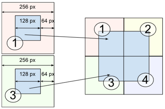 - The layer image is divided into parts of size 256 × 256 pixels. This is performed to avoid scaling the image during the dataset preprocessing before model training, which could lead to loss of information about the original image and its details as well as blurring of images.