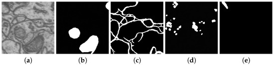 For our study, we utilized the EPFL dataset, which is publicly available at https://www.epfl.ch/labs/cvlab/data/data-em/, accessed on 2 December 2024. The data used in this work were acquired by a focused ion beam scanning electron microscope (FIB-SEM, Zeiss NVision40), which uses a focused beam of gallium ions to mill the surface of a sample and an electron beam to image the milled face. The milling process removes approximately 5 nm of the surface, while the scanning beam produces images with a pixel size of 5 × 5 nm [5]. This dataset comprises images obtained from the CA1 region of the hippocampus in the brain, with a voxel resolution of approximately 5 × 5 × 5 nm. The training set includes 165 image stack fragments, each with a size of 1024 × 768 pixels. This dataset was acquired by Graham Knott and Marco Cantoni at EPFL. Notably, the original EPFL dataset provides annotations exclusively for mitochondria. The test set of the EPFL dataset consists of 165 full-size images (1024 × 768 pixels) with corresponding ground truth annotations for mitochondria. These test images are used to evaluate the generalization capability of trained models on unseen data. An example of the dataset is illustrated in Figure 2.