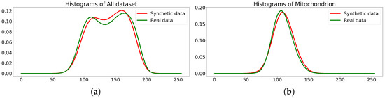 Diffusion synthetic datasets with a volume of 1008 frames (images) of size 256 × 256, generated by the diffusion model trained on 42 layers of the original EPFL6 dataset, gave good results, especially for mitochondria, corresponding to the statistics of the original dataset.