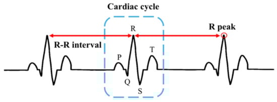 As mentioned previously, an ECG records the electrical activity of the heart [], and this activity, including depolarization and repolarization, is represented as a signal. Figure 1 shows an example of ECG data, illustrating the involved morphology and providing a brief description. In ECG data, an individual cardiac cycle is electrically represented by P, Q, R, S, and T waves. The interval between two successive R waves is referred to as the R–R interval. Under normal conditions, each component exhibits a distinct morphology, and deviations from this typical morphology can indicate abnormal electrical activity, which may suggest cardiac dysfunction [].