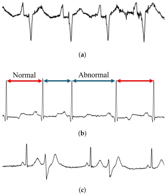 Abnormalities in the morphology are possible in any of the components. Herein, abnormal ECGs are categorized into three groups based on their characteristics (Figure 2). First, we consider shape abnormalities (Figure 2a), where the shape of components either changes or disappears from the cycle. Second, we consider R–R interval abnormalities. In these cases, as shown in Figure 2b, the length of R–R intervals becomes abnormal, either shorter or longer than usual []. The third group involves a mixture of shape and R–R interval abnormalities. As shown in Figure 2c, the abnormalities in the first two groups are visible. By analyzing these abnormalities, the location or cause of the abnormal electrical activity can be identified.