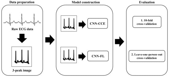 Figure 3 presents an overview of the study methodology. The study was divided into the following three processes. Initially, the numerical ECG data were transformed into image data (hereinafter referred to as ECG images). Then, the ECG images were input to two CNN models with different loss functions. The models then learned the characteristics of the ECG images. Finally, the classification performance of each model was evaluated using two types of cross-validation (CV), i.e., randomized 10-fold CV and leave-one-person-out CV.