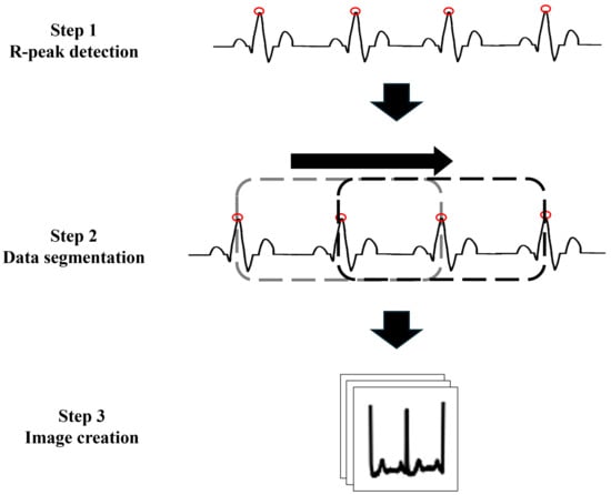 Figure 4 illustrates the three steps involved in image creation. First, the R-peak of all cardiac cycles was detected using the WFDB toolbox [] Python package version 4.1.2. Then, the data were segmented, beginning from the first R-peak. Here, the segmentation window covered two half-cycles and one complete cycle. Each segment of ECG data was then converted to a grayscale image (64 × 64 pixels), as shown in Figure 4.