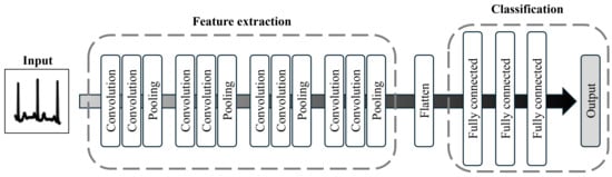 To classify the arrhythmia classes, a CNN, which exhibits an architecture of artificial neural networks [], was selected as the classification model in this study. Owing to their excellent performance, CNNs are employed for numerous tasks, including image classification []. Typically, a CNN comprises three types of layer, i.e., convolution, pooling, and fully connected layers. Through the convolution and pooling layers, the CNN model can extract features from the input data, thereby eliminating the need for manual feature extraction.