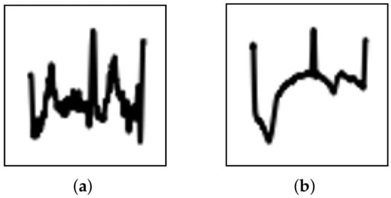 As mentioned previously, ECG images were employed as the model input herein. According to a previous study [], transforming signal data to images can reduce the effects of noise and trends; however, during the evaluation, several images were misidentified. Upon further investigation, these misidentified images could be categorized into two types, i.e., strong noise and strong trend (Figure 6). This suggests that image transformation may not eliminate these effects completely. Thus, the CNN must be improved to prevent the effects from noise and trends. As suggested in previous research [], enhancing the denoising and detrending abilities of CNNs can be realized by incorporating residual blocks and attention mechanisms. To solve this problem, implementing these components should be considered in future study.