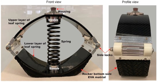 The ELS-foot design includes upper and lower layers of leaf springs, which were constructed by using carbon fibers, spring sleeves, a sleeve housing, side locks, and a rocker bottom sole, which was made by using ethylene-vinyl acetate (EVA) (Figure 1). The ELS-foot was designed to innovatively provide optimal balance between cushioning and efficient energy management through the leaf springs, which effectively store and return elastic energy. The rocker bottom sole improves propulsion by redistributing load and smoothing the ground reaction forces. It reduces peak GRF and creates a more controlled movement, helping maintain stability by ensuring a smoother shift in the center of pressure during walking. This minimizes abrupt changes that could cause imbalance. The curved design, along with a platen platform, also provides cushioning and support, reducing the risk of falls by preventing sudden forward momentum or instability.