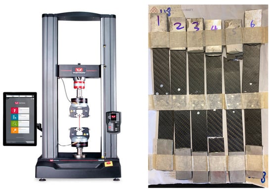 Tensile tests were conducted to evaluate the mechanical properties of the materials with different layers and orientations. The tests were carried out by using an Instron 6000 mechanical testing machine. Each specimen was subjected to 10 cycles to ensure reliability of the results. The specimens were designed to have a rectangular bar shape with dimensions of 250 mm × 25 mm × 5 mm (see Figure 2). Six replicates of each specimen were prepared, and their average tensile strength was calculated.