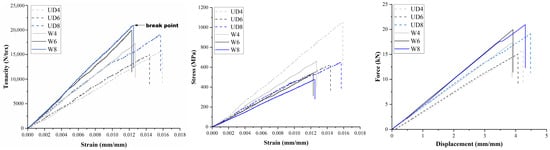 To identify the most suitable composite material for the ELS-foot design, pre-impregnated materials including 3K twill weave carbon fibers and 150 gsm unidirectional carbon fibers provided by TORAY INDUSTRIES (Tokyo, Japan) were used to prepare the specimens. To account for the influence of material thickness and orientation on the mechanical properties, a total of 6 samples were prepared in configurations of a four-layer laminate [0°/90°/0°/90°], six-layer laminate [0°/+45°/90°/90°/−45°/0°], and eight-layer laminate [0°/90°/+45°/−45°/−45°/+45°/90°/0°] (see details in Table 1). This structured approach allows for a detailed comparison of the material performance under tensile stress, thus providing invaluable insights into their suitability for ELS-foot designs [16]. The thickness and weight of the specimens prepared with different number of layers and material orientations are listed in Table 1.