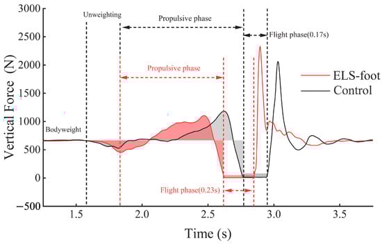 The participants are able to obtain a higher maximum countermovement jump height with the ELS-foot, and the average flight time is longer (0.23 s) than that of the control (0.17 s) during propulsion (Figure 6). Willwacher et al. [37] found that a below-knee amputee can achieve a similar jump distance as that of world-class athletes who do not have an amputation by using a more effective take-off technique in the long jump. The take-off phase involves the transition from downward movement (countermovement) to upward propulsion. A longer take-off time can allow for greater force development and more effective use of the stretch-shortening cycle, which can enhance the jump height. Hobara et al. [38] found that sprinters who are below-knee transtibial amputees have a longer flight time than other transfemoral amputee and non-amputee sprinters during jumping, which indicates that they can jump higher at a given frequency. Our findings show that the ELS-foot design improves the power generation at push off, and this energy can be effectively transferred to propulsion and result in a higher jump height.