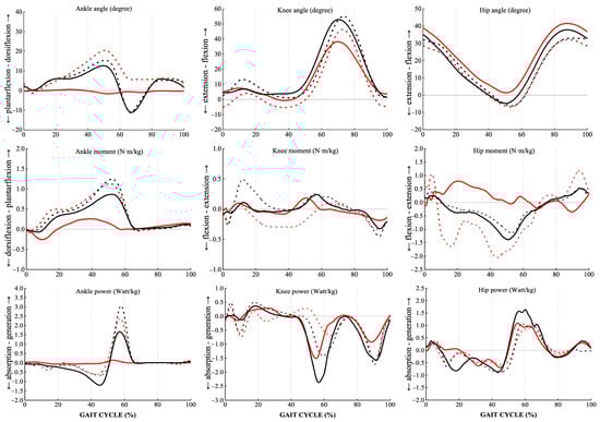 Mean of kinematics and kinetics of lower limb across gait cycle with ELS-foot and control prostheses. 0% indicates heel strike; 100% indicates subsequent heel strike; red solid lines indicate residual limb side with ELS-foot, and red dotted lines indicate intact limb side with ELS-foot; black solid lines indicate residual limb side of control, and black dotted lines indicate intact limb of control side.