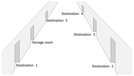 Schematic representation of the setting with entrances to the storage room and the five destination rooms.